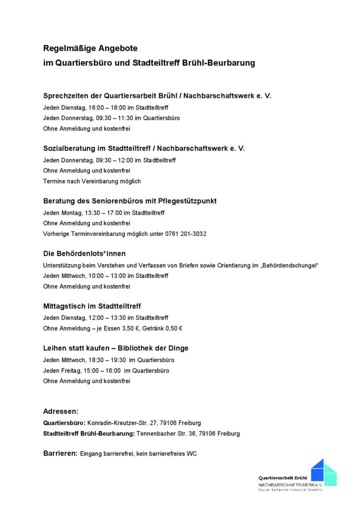Im Stadtteiltreff (Tennenbacher Str. 36, 79106 Freiburg) und im Quartiersbüro (Konradin-Kreutzer-Str.17, 79106 Freiburg)